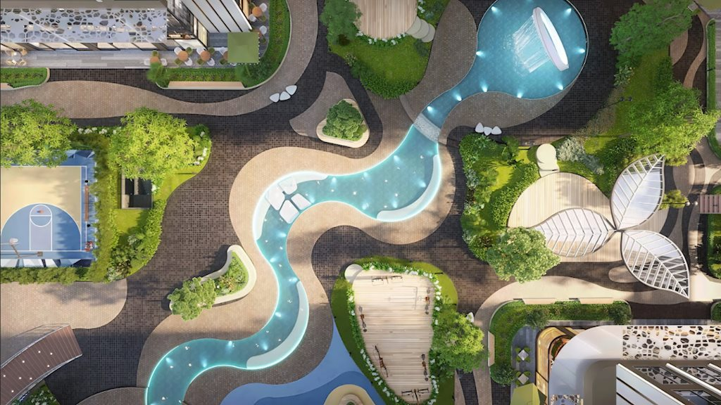 Dọc theo dòng suối, mặt nước mở rộng thành những “vịnh nhỏ” xen kẽ với mảng xanh, nơi chuỗi tiện ích thư giãn và vận động được bố trí khéo léo để khuyến khích cư dân bước ra khỏi nhà: ghế nghỉ đọc sách, sân chơi trẻ em, khu gym và yoga ngoài trời, quán café, những lối dạo bộ xanh mát và góc thư giãn ven bờ...