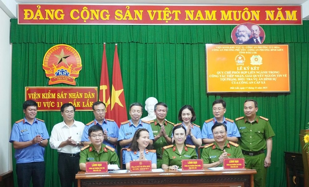 (kiemsat.vn) Ngày 17/11/2025, tại trụ sở VKND khu vực 11- Đắk Lắk, VKSND khu vực 11 đã chủ trì ký kết Quy chế phối hợp liên ngành trong công tác tiếp nhận, giải quyết nguồn tin về tội phạm và điều tra vụ án hình sự của Công an cấp xã với Công an các phường Tuy Hòa, Phú Yên và Bình Kiến.