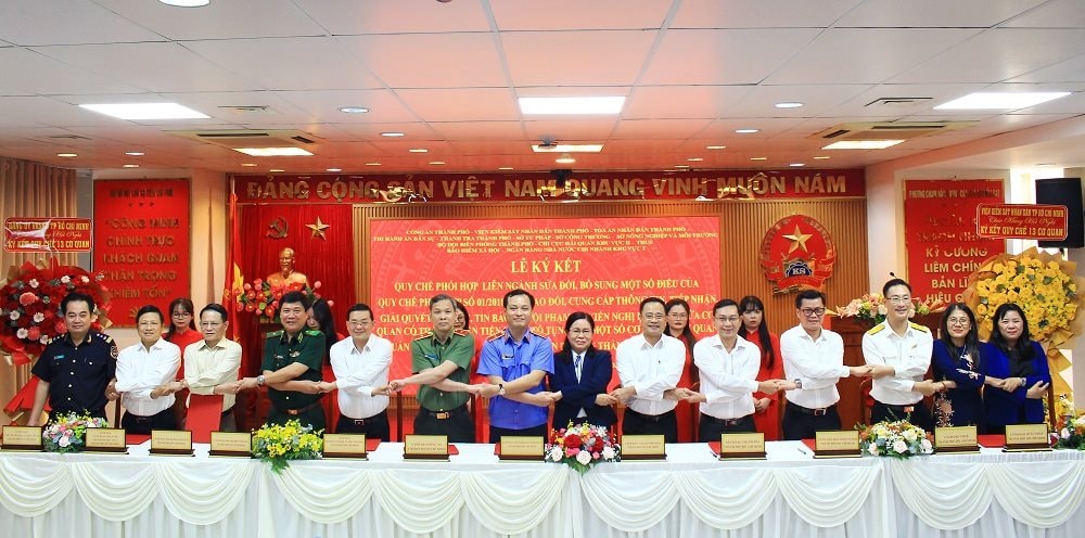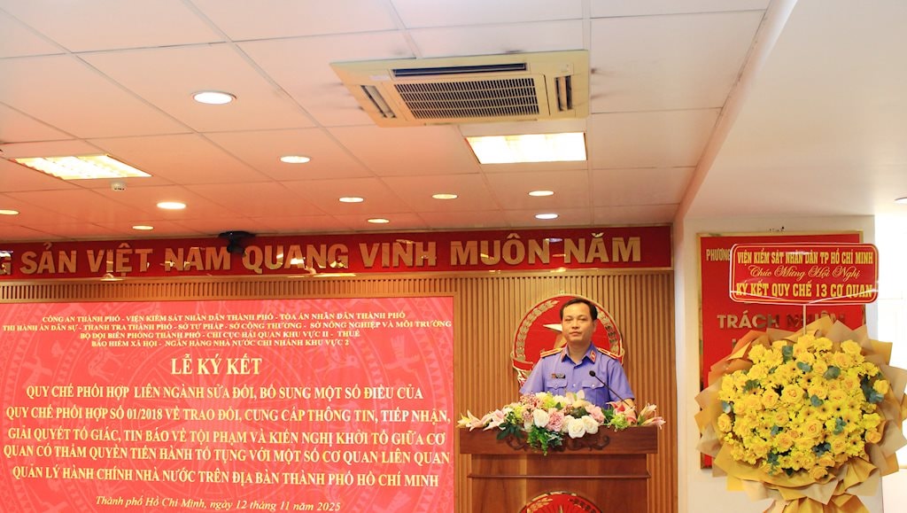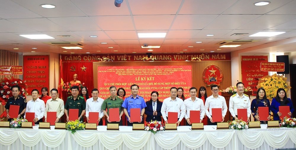 (kiemsat.vn) Sáng ngày 12/11/2025, VKSND TP. Hồ Chí Minh chủ trì tổ chức Lễ ký kết Quy chế phối hợp liên ngành giữa Viện kiểm sát, Tòa án, Công an, Thi hành án dân sự, Ban Chỉ huy Bộ đội biên phòng Thành phố, Thanh tra, Sở Tư pháp, Sở Nông nghiệp và Môi trường, Thuế, Chi cục Hải quan Khu vực II, Sở Công thương, Ngân hàng Nhà nước Chi nhánh Khu vực 2, Bảo hiểm xã hội Thành phố trong việc cung cấp, trao đổi thông tin, tiếp nhận, giải quyết tố giác, tin báo về tội phạm và kiến nghị khởi tố.