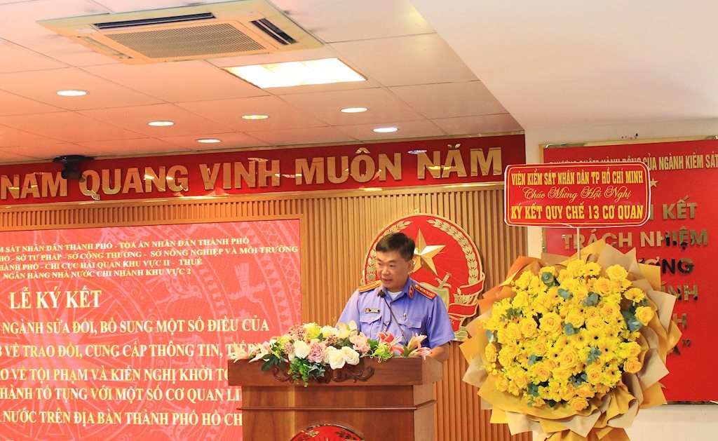 Phát biểu khai mạc buổi Lễ ký kết, đồng chí Lê Văn Đông, Viện trưởng VKSND TP. Hồ Chí Minh nhấn mạnh, trong thời gian qua, nhận thức được tầm quan trọng của công tác phối hợp, các cơ quan, ban, ngành trên địa bàn thành phố đã tăng cường trao đổi, cung cấp thông tin về tội phạm, là cơ sở quan trọng giúp các cơ quan chức năng như Công an, Viện kiểm sát, Tòa án, Hải quan, Bộ đội Biên phòng, Thanh tra, Thuế, Ngân hàng,… phát hiện sớm các dấu hiệu vi phạm pháp luật, phục vụ công tác điều tra, truy tố, xét xử, đồng thời nâng cao hiệu quả phòng ngừa, răn đe tội phạm.